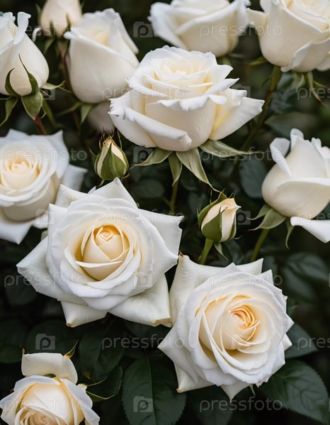 Среди ярко-зеленых листьев потрясающий букет белых роз процветает под мягким солнечным светом, излучая свежесть и элегантность в спокойной садовой обстановке Generative AI