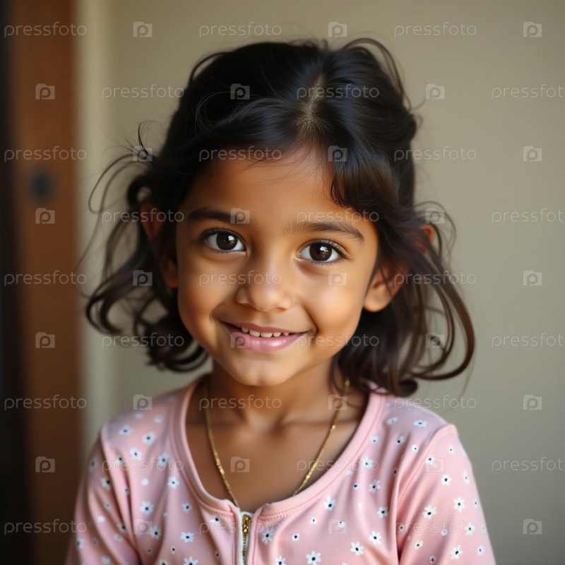 Веселая девушка с темными кудрявыми волосами блестит сияющей улыбкой, демонстрируя свой игривый дух.Мягкое освещение в комнате улучшает ее радостное выражение лица, когда она наслаждается моментом