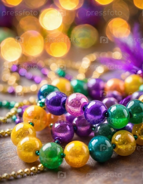 Красочные бусы в фиолетовом, зеленом и золотом цветах создают праздничную атмосферу на сверкающем фоне бокеха, олицетворяя радостный дух торжеств Марди Граса в Новом Орлеане