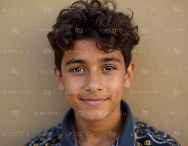 Молодой йеменский мальчик с кудрявыми волосами тепло улыбается на простой стене, его очаровательный взгляд отражает радость и любопытство в сердце Йемена в яркий день