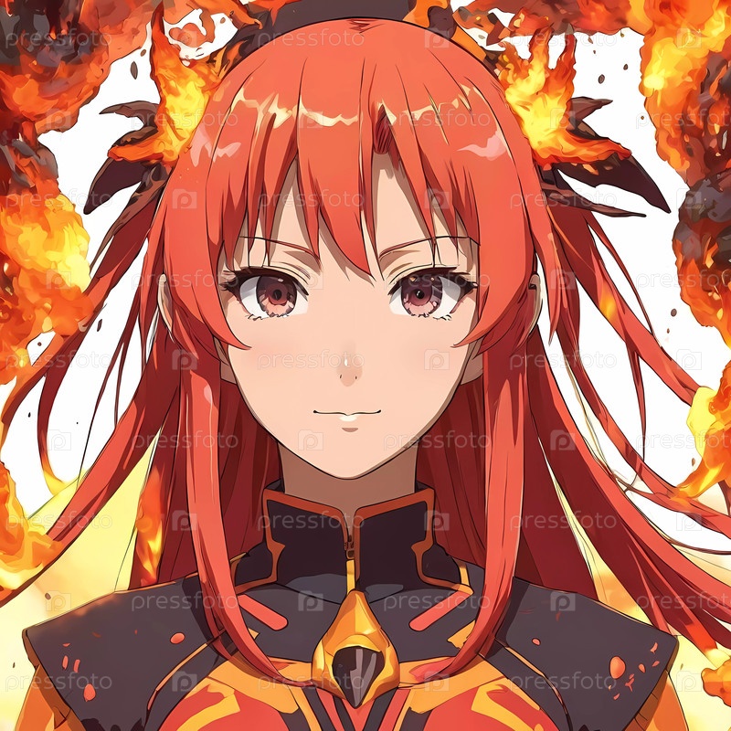Среди вращающихся пламен и расплавленных углей аниме-персонаж вулкан девушки стоит высоко, излучая уверенность и энергию, захватывая суть сырой силы огня на закате