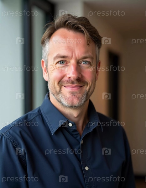 Веселый шведский мужчина с яркими светлыми волосами тепло улыбается, одетый в темную рубашку.Он стоит в стильном помещении, освещенном мягким естественным светом