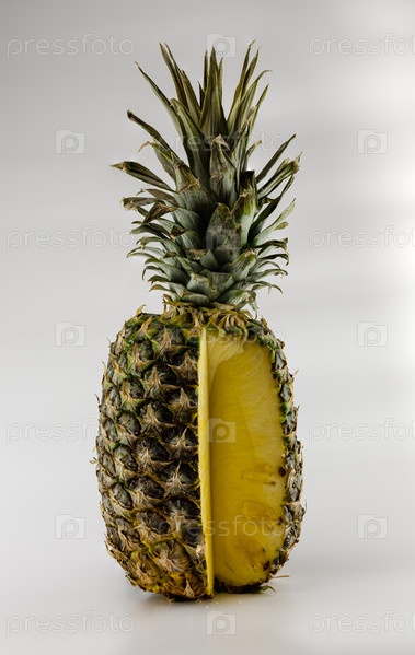 Ананас с листвой на белом фоне в разрезе