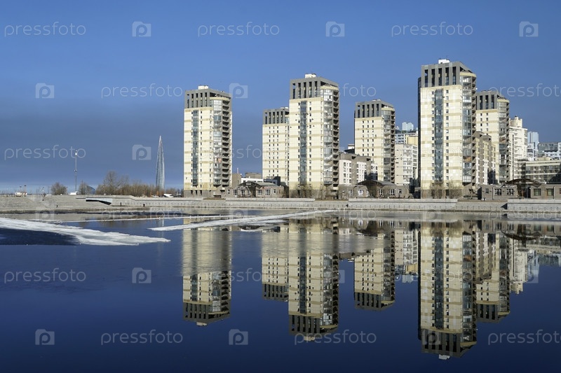 Городской, весенний пейзаж с отражением жилых домов в воде реки