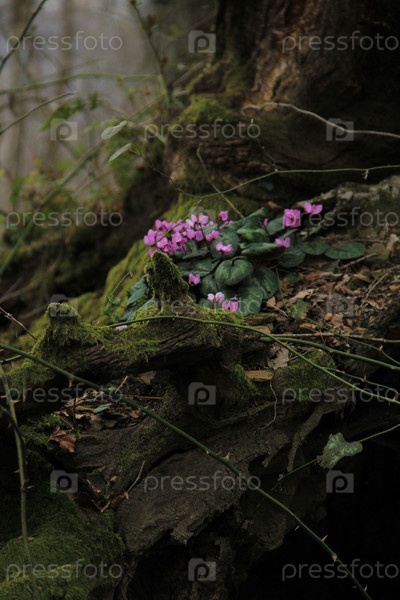 Цикламена в лесной композиции. Цикламена, пень, мох
