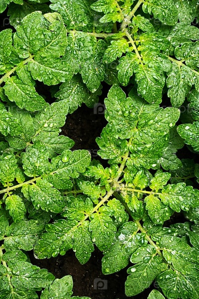 Зеленые листья томата с каплями воды после дождя, природная текстура растения