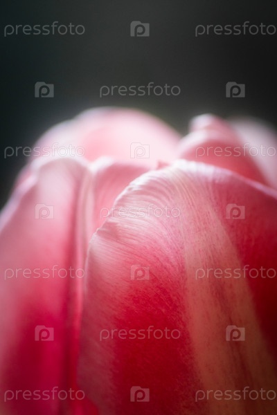 Экстремальный крупный план лепестков розового тюльпана с нежной текстурой и прожилками. Мягкое боке на темном фоне, романтичное и нежное настроение