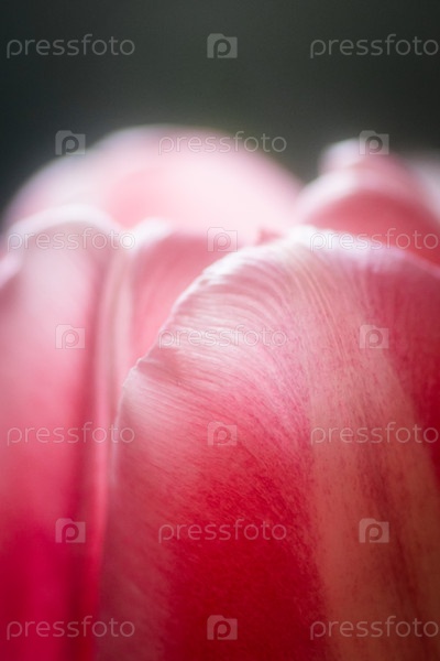 Экстремальный крупный план лепестков розового тюльпана с нежной текстурой и прожилками. Мягкое боке на темном фоне, романтичное и нежное настроение