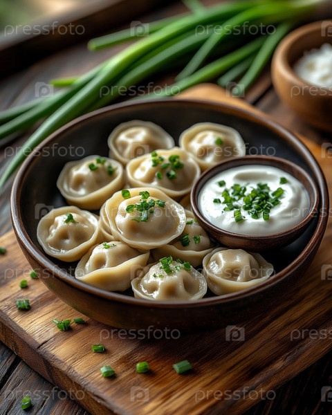 Традиционные русские пельмени с зеленью и сметаной