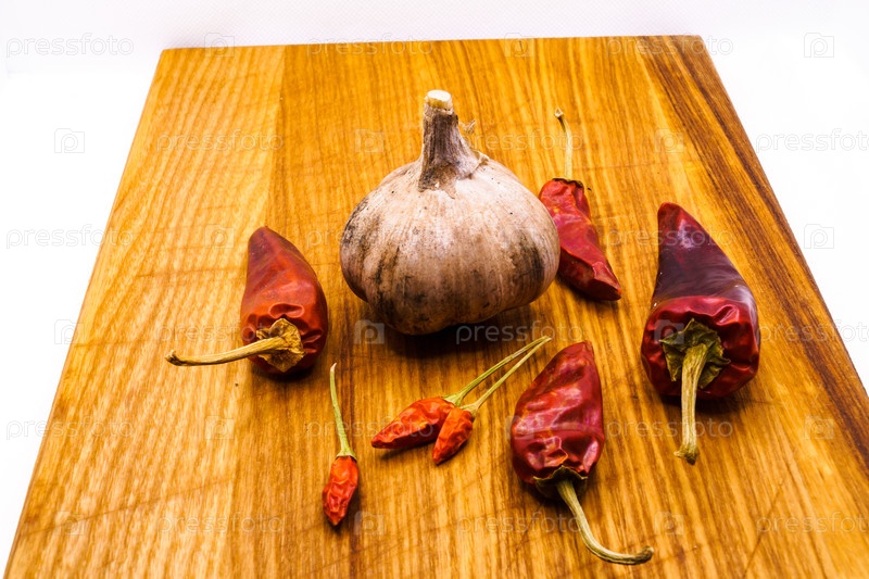 Натюрморт. Головка чеснока и стручки жгучего перца на разделочной доске
