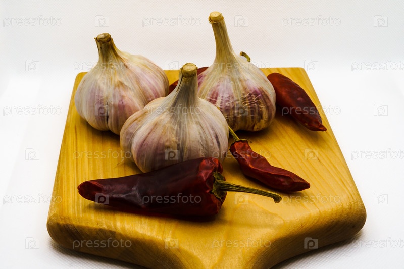 Натюрморт. Головки чеснока и стручки жгучего перца на разделочной доске