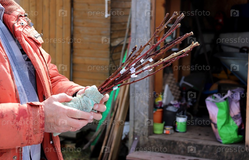Руки мужчины держат кучу отрубок вишневых деревьев