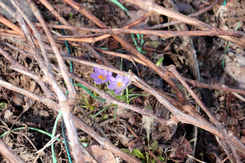 Ветви виноградной лозы скрывают голубые цветы крокуса в весеннем саду