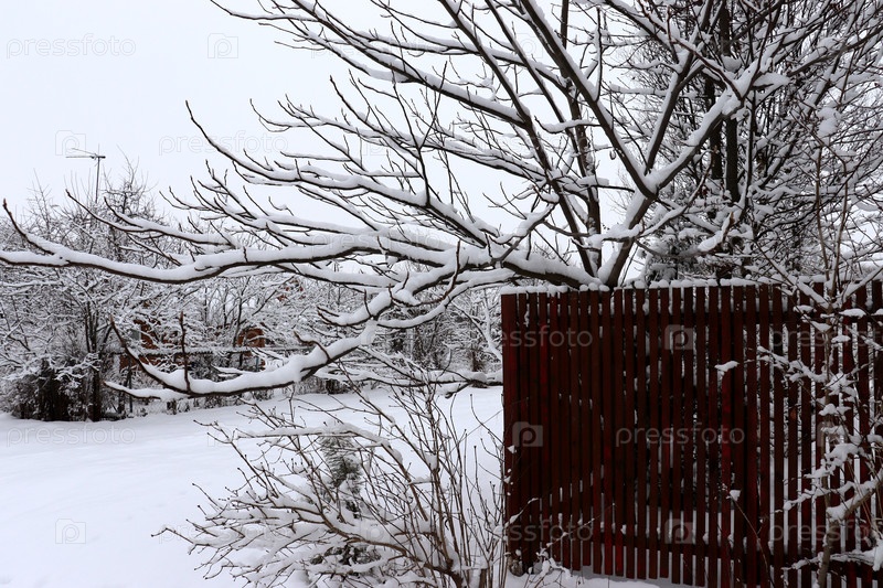 Уголок сельской улицы, часть забора с деревьями и заснеженным полем