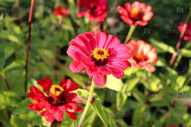 Коралловые зиннии цветут в клумбе осеннего сада в солнечный день