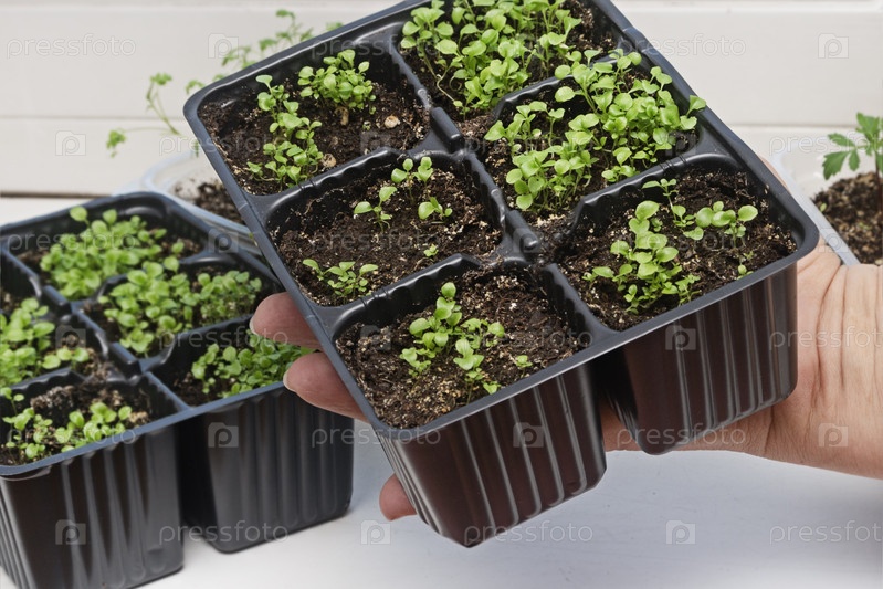 Молодые сочные зеленые саженцы лобелии эринус, растущие в лотке для рассады, который держит в руке. Концепция весеннего садоводства, домашние растения, выращенные из семян в помещении, на белом фоне
