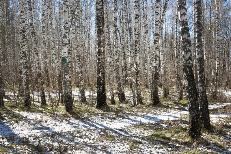Солнечный свет через белые стволы березовой рощи весной. живописный вид на лесную тропу с пятнами тающего снега на земле под чистым голубым небом. сезонная смена природы, пробуждение леса в марте