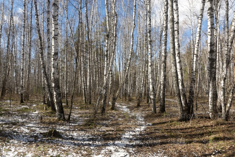 Солнечный свет через белые стволы березовой рощи весной. живописный вид на лесную тропу с пятнами тающего снега на земле под чистым голубым небом. сезонная смена природы, пробуждение леса в марте