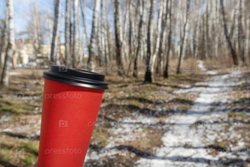Красная бумажная чашка с кофе не должна быть брошена на землю в березовом лесу весной