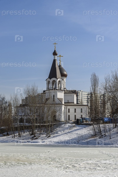 Церковь иконы Божией Матери Неопалимая Купина с характерными куполами и золотыми крестами величественно возвышается на фоне заснеженного пейзажа. Пейзаж обрамлен голыми деревьями и замерзшим водоемом, что подчеркивает безмятежную атмосферу зимы в городски