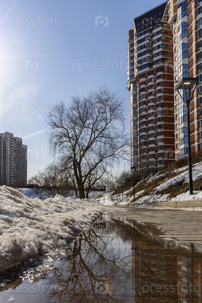 Московский Городской пейзаж, отражающий весеннее таяние снега и высокие здания