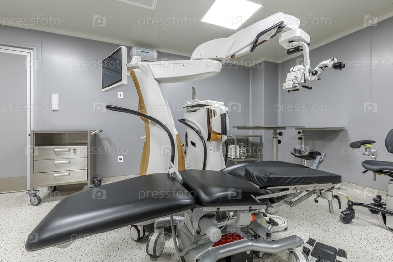 Комплект высокотехнологичной офтальмохирургии. Содержит современную лазерную систему коррекции зрения, интегрированный хирургический микроскоп и регулируемую кровать пациента. Чистый стерильный медицинский интерьер с профессиональным диагностическим обору