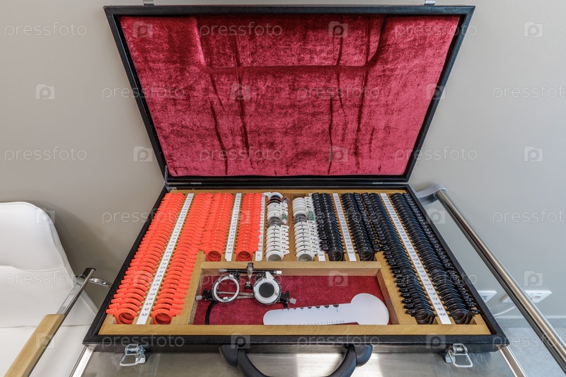 Комплексный корпус для офтальмологических пробных линз с красно-бархатным интерьером. Обладает широким разнообразием сферических и цилиндрических линз, а также испытательной рамой для коррекции зрения и осмотра глаз. Необходимый инструмент для оптометрист