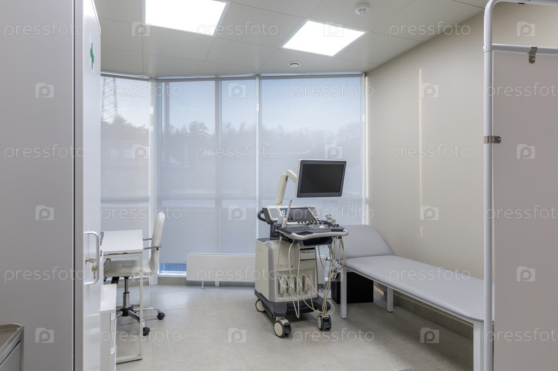 Яркий медицинский интерьер комнаты для ультразвукового обследования. отличается профессиональным диагностическим сканером с несколькими зондами, медицинским диваном и рабочей станцией врача. Чистый минималистический дизайн клиники с большими окнами