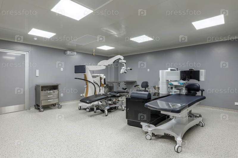 Просторная современная операционная в клинике. Профессиональные офтальмические лазерные системы, хирургические микроскопы и регулируемые кровати для пациентов. Чистый стерильный интерьер медицинского обслуживания с современным освещением