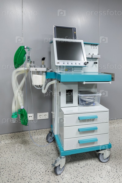 Современная анестетическая рабочая станция в больнице. Обладает экраном цифрового дыхательного аппарата, респираторными трубками с зелеными пакетами и мобильной медицинской тележкой. Высокотехнологичное оборудование для хирургии и отделений интенсивной те