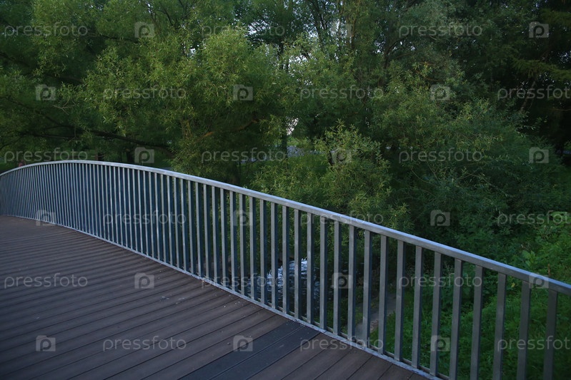 Синий металлический мост в парке среди зелени на свежем воздухе