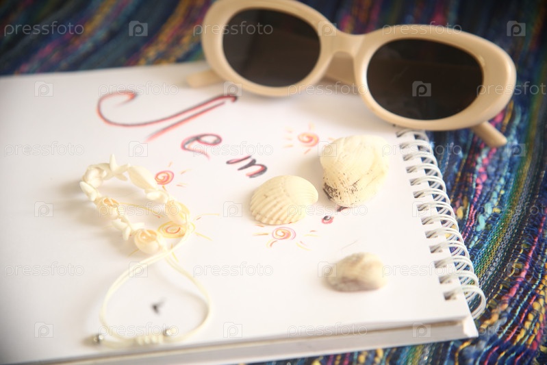 Браслет, раковины, солнцезащитные очки и тетрадь с надписью "лето" на столе