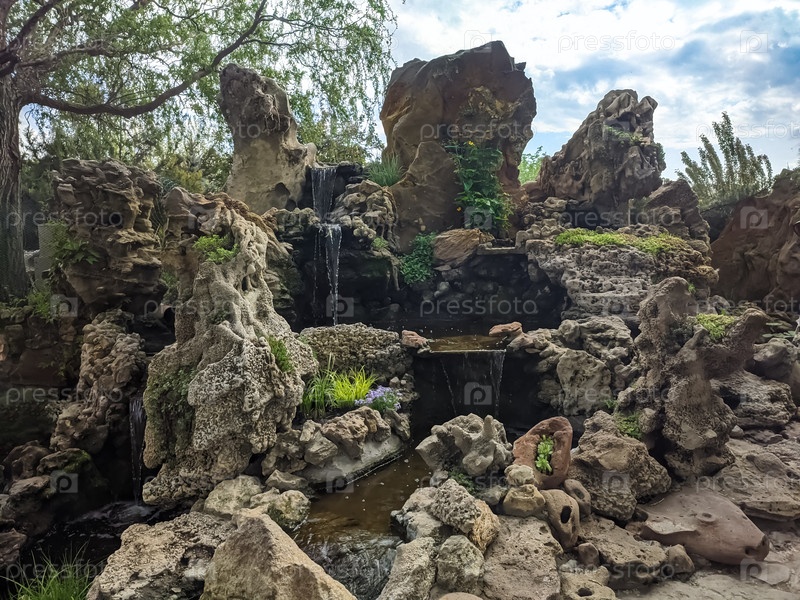 Искусственный водопад и скальный ландшафт в саду под облачным небом