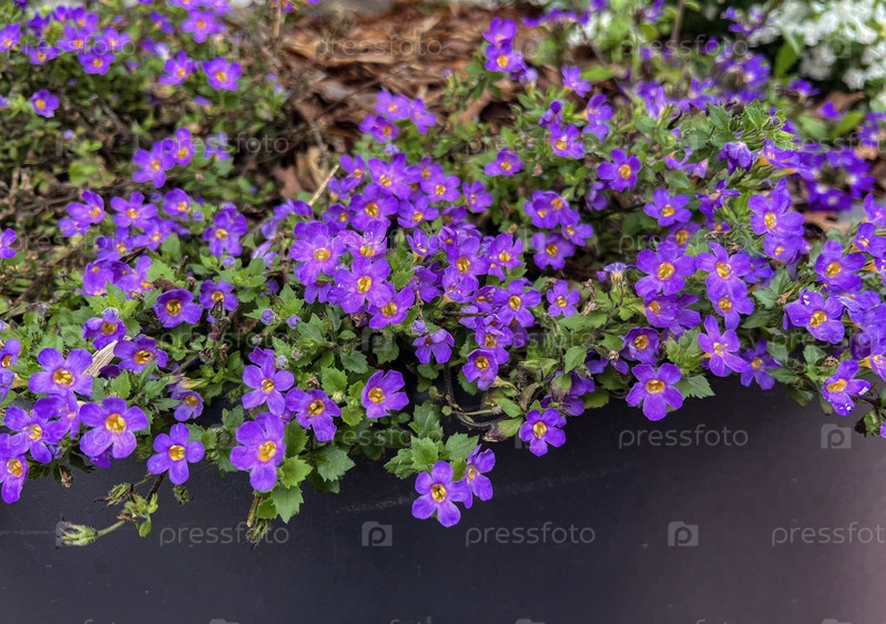 Фиолетовые цветы с желтым центром процветают в черном садовом горшке, демонстрируя свою красоту на солнечной открытой площадке