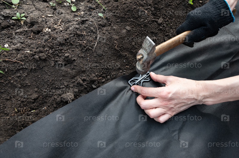 Человек в сапогах и перчатках встает на колени, устанавливая ткань из черного сорняка