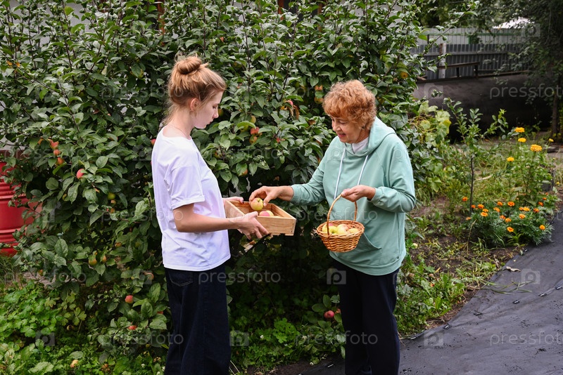 Женщина и девочка собирают яблоки в саду во второй половине дня