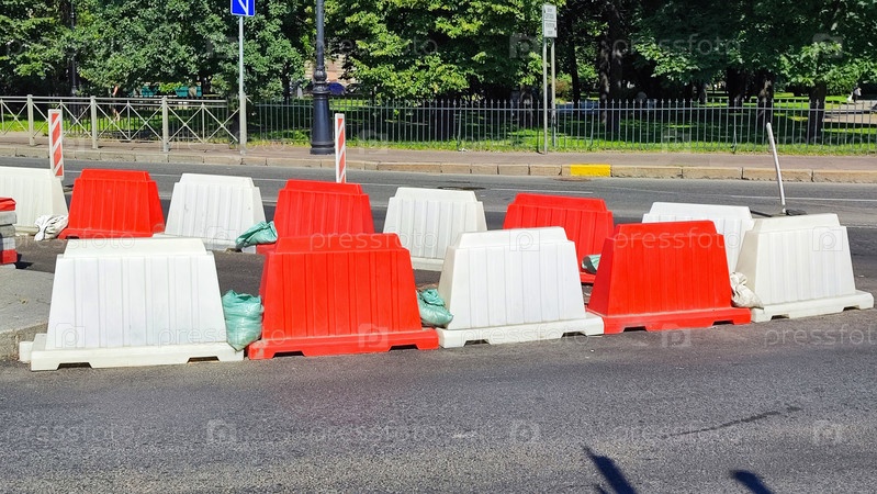 Ярко окрашенные дорожные барьеры в красно-белом цвете вырезают край городской улицы, указывая на закрытие дороги с целью технического обслуживания
