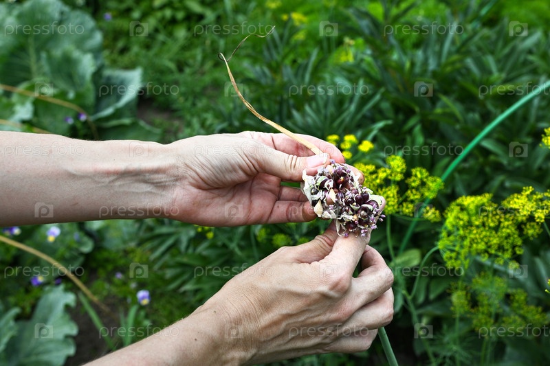 Руки собирают чеснок в саду летом