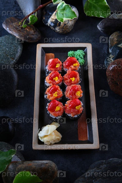 Суши. традиционная японская кухня. роллы с хайваром тобико и украшенные кусочком клубники. изысканное представление. белый имбир