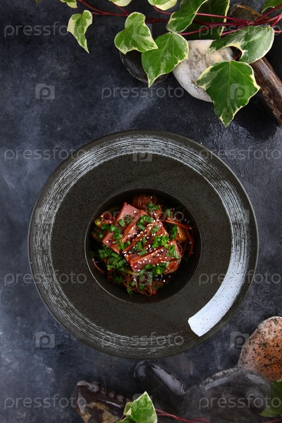 Традиционное азиатское блюдо. Соба-нудлы с овощами и соусом терьяки. Семена кунжута и зеленые луки. Здоровое питание. Плоская ложка. Вид сверху