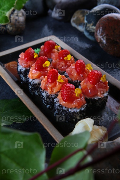 Традиционная японская кухня роллы с хайваром тобико и украшенные куском клубники изысканное представление