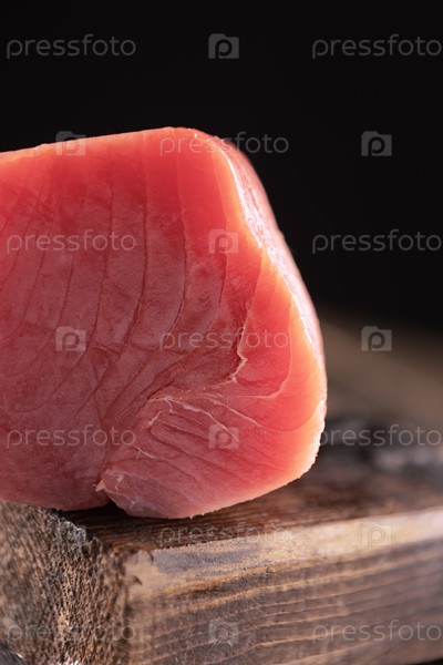 Филе сырого тунца. Филе свежего тунина. Большой кусок сырой рыбной бифштекса для суши и сашими. Бифштекс с сырым тунисом, филе свежей рыбы для японской кухни