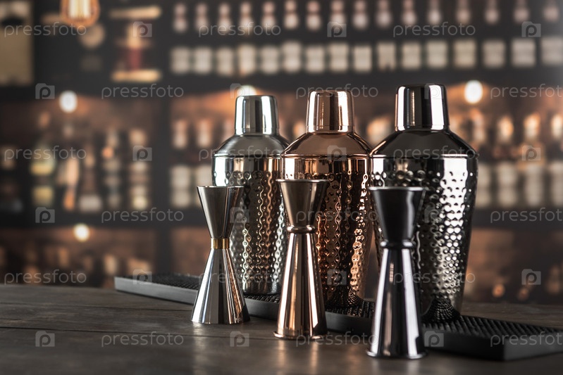 Шейкеры и джиггеры на барной стойке. Набор самых популярных аксессуаров для баров. Профессиональные коктейлевые шейкеры и джиггеры в ресторане-баре. Три многоцветные металлические трещины