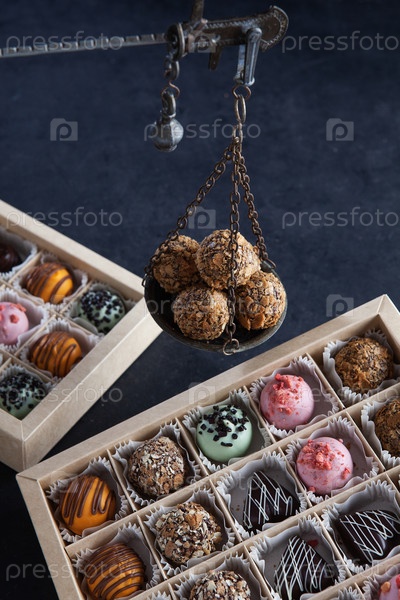 Есть шоколады с вафли на весах. Миниатюрные винтажные весы. Ассортимент бельгийских шоколадных изделий. Ряд различных конфет в коробке. Вид сверху. Подарок на праздник