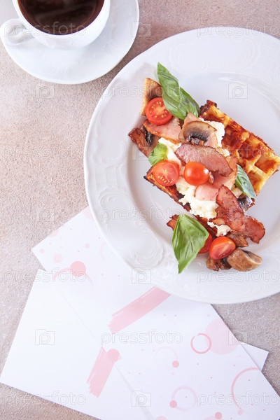 Венские вафли с беконом, шампиньонами и вишневыми помидорами на картофельной подушке. Вкусный и питательный завтрак. Концепция делового завтрака. Вид сверху