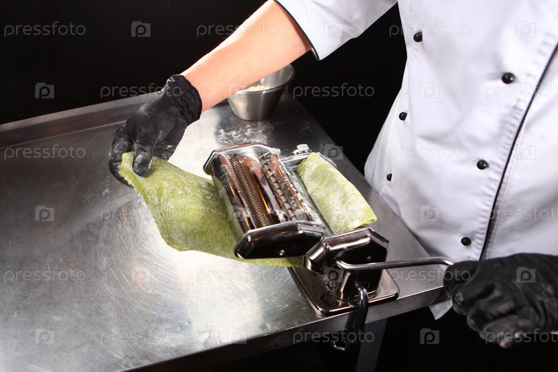 Шеф-повар готовит тесто со шпинатом.Машина для приготовления макаронных изделий и разворачивания теста.Шпинат является естественным красителем для теста зеленого цвета.Приготовление пасты со спанаком