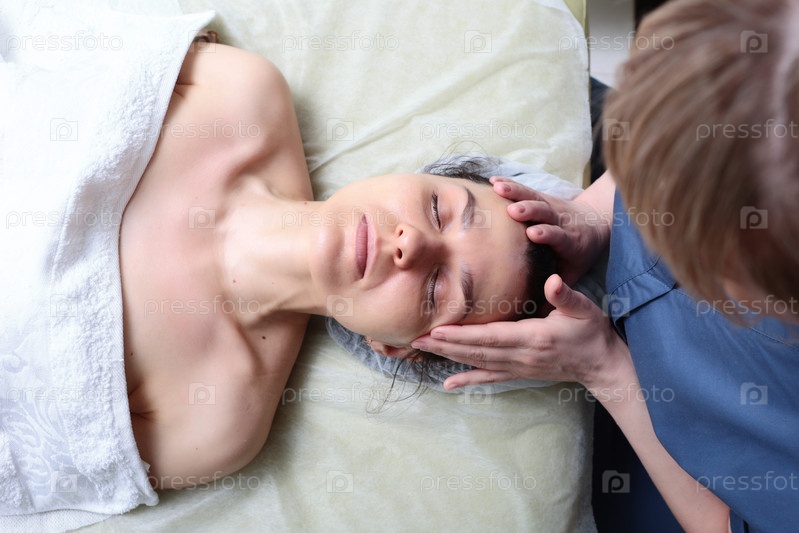 Массаж лица.Массажист дает массаж лица молодой женщине.Сохранение юности и эластичности кожи.Концепция красоты.Вид сверху