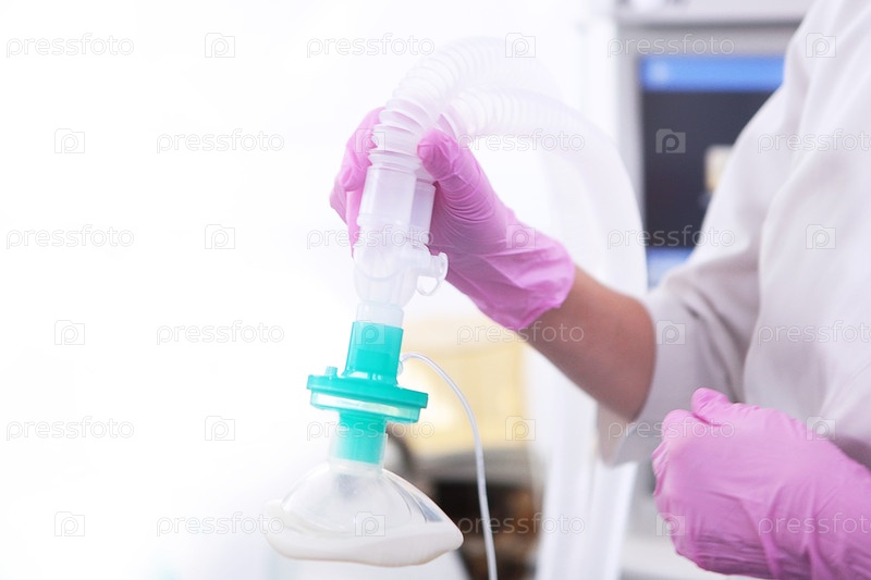Кислородная маска в руках врача. Концепция экстренной и первой помощи. Искусственное дыхание. Подготовка пациента к операции. Введение в анестезию. Общая анестезия