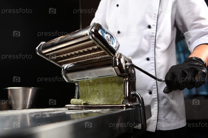 Шеф-повар готовит тесто со шпинатом.Дегу выкручивали с помощью машины для пасты.Приготовление пасты со спанаком