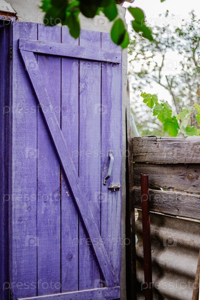 Рустическая фиолетовая деревянная дверь с выветрившимися досками и металлическим замком в садовой обстановке